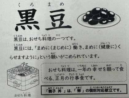 今日は、黒豆の煮ものが登場しました。おせち料理の黒豆の煮ものには、まめに(丈夫で健康に)暮らせますようにという願いがこめられています。