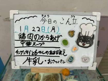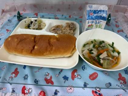 今日の給食は「鶏肉のからあげ・中華スープ・チンゲンサイともやしの甘酢あえ・ごはん・牛乳」です。