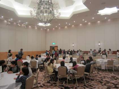 アルカリ泉の「ひまわりの湯」での入浴と買い物の後は、お楽しみのバイキングでの夕食。おなか一杯の幸せそうな顔をたくさん見つけました。