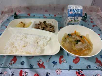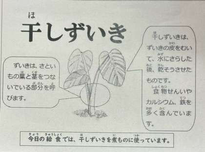 今日の給食は、豚肉と干しずいきのみそ煮、すまし汁、あげ焼きじゃが、ごはん、牛乳でした。