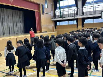 あいにくの雨でしたので、講堂で児童朝会を行いました。