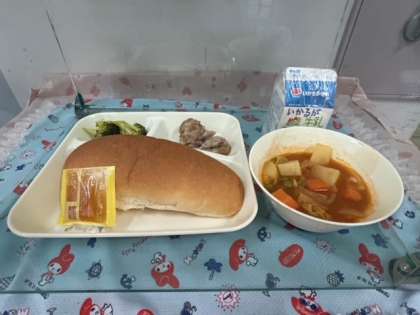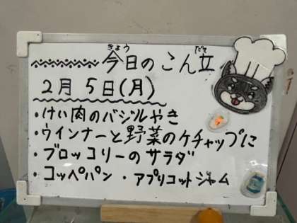 今日の給食は「鶏肉のバジル焼き・ウインナーと野菜のケチャップ煮・ブロッコリーのサラダ・コッペパン・アプリコットジャム・牛乳」です。
