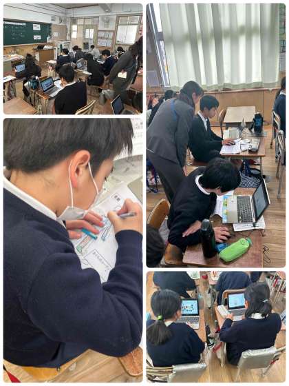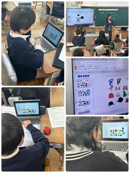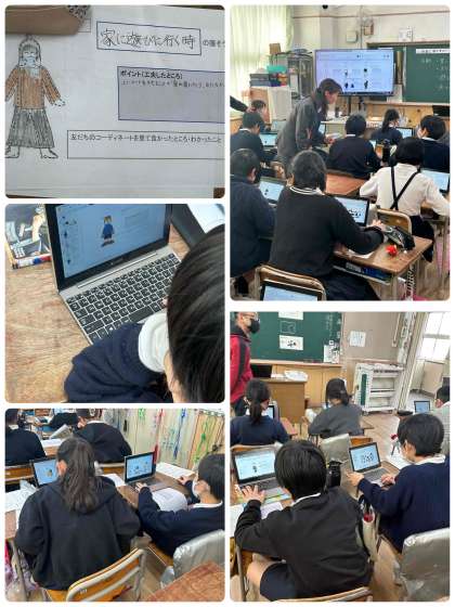 5時間目に、暖かくなるように工夫した衣服について考える学習を行いました。どういうところへどういう目的で行くのかを設定し、それに相応しい服装を自分たちでコーディネートしていきました。端末をうまく使い,自分の考えを服装として表していきました。紙に絵で描く子もいました。