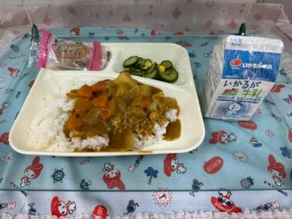 今日の給食は「チキンレバーカレーライス・きゅうりとコーンのサラダ・スイートポテト・牛乳」です。