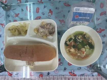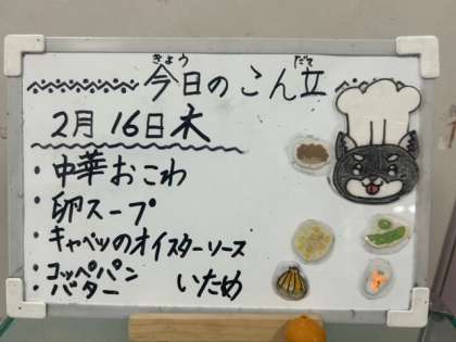 今日の給食は「中華おこわ・卵スープ・キャベツのオイスターソースいため・コッペパン・バター・牛乳」です。