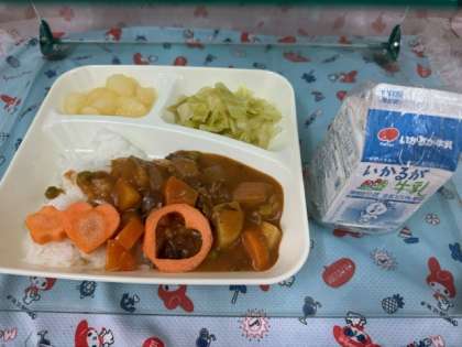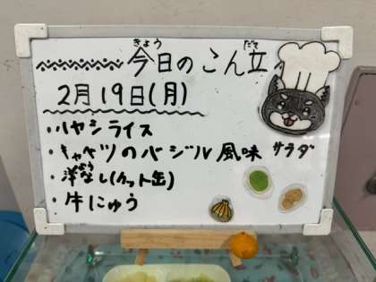 今日の給食は「ハヤシライス・キャベツのバジル風味サラダ・洋なし(カット缶)・牛乳」です。