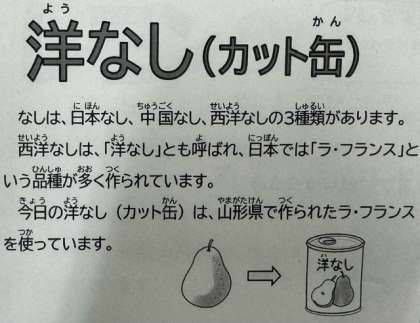 今日の「洋なし(カット缶)」は山形県産の「ラ・フランス」を使っています。洋なしは、丸い日本なしに比べて、上が細く、下は大きいひょうたんのような形をしています。食感はとろけるようになめらかで、濃厚な香りと甘味が特徴です。