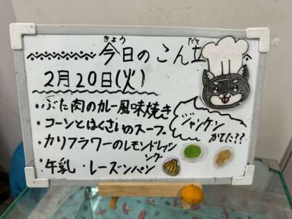 今日の給食は「豚肉のカレー風味焼き・コーンとはくさいのスープ・カリフラワーのレモンドレッシング・レーズンパン・牛乳」です。