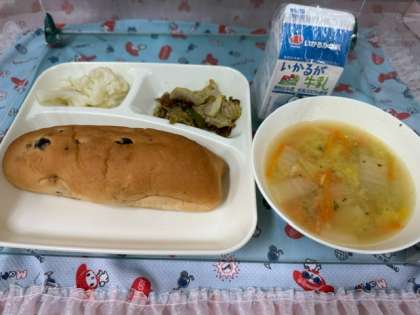 今日は、「はくさい」を使った「はくさいのスープ」が登場しました。コーンや鶏肉、じゃがいも、にんじん、パセリなどが入り、彩りもきれいなスープでした。