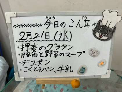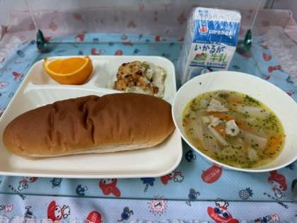 今日の給食は、押麦のグラタン、豚肉と野菜のスープ、デコポン、こくとうパン、牛乳でした。