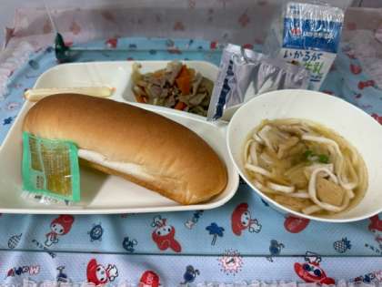 今日の給食は「豚肉とごぼうの煮もの・なにわうどん・棒チーズ・コッペパン・リンゴジャム・牛乳」です。