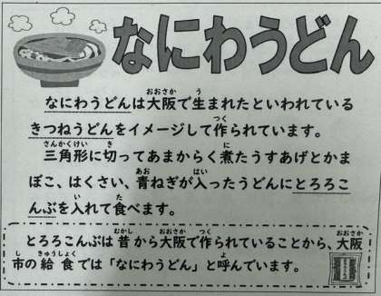 今日の「なにわうどん」は、年に一度登場する献立です。うすあげは、1枚を1/16の三角形に切って、だしとしょうゆなどで甘辛く煮含め、最後にうどんと合わせます。