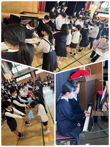 在校生から6年生へメッセージ式紙を、6年生から在校生へ手作りぞうきんを、贈り合いました。