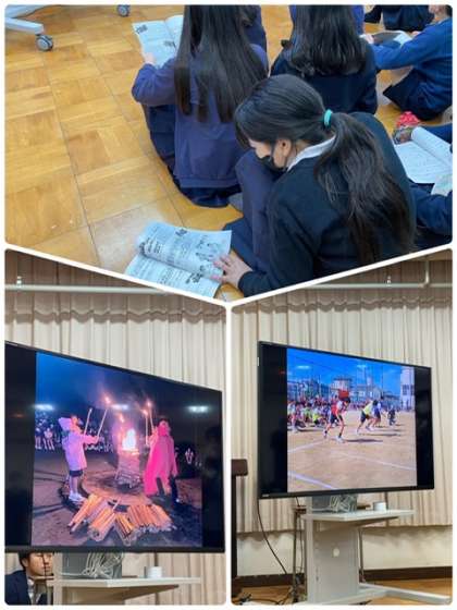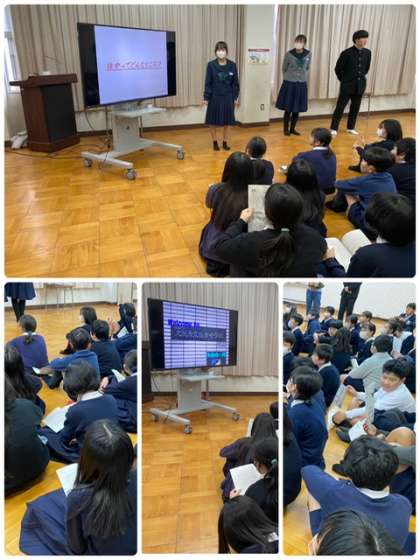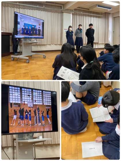 住吉中学校の生徒会の役員の人が来て、中学校はどんなところなのか冊子や写真を使って説明してくれました。グラウンドや体育館、部活動の様子などを見せてもらい、校歌も歌ってくれました。聞きたいこともたくさん出てきて、質問にも答えてもらいました。