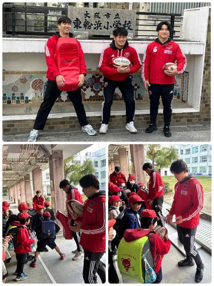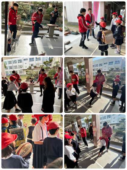 玄関で、元気にあいさつを交わした後、ハイタッチをしたり、ボールでパスをしたり、タックルを経験させてもらったりしました。