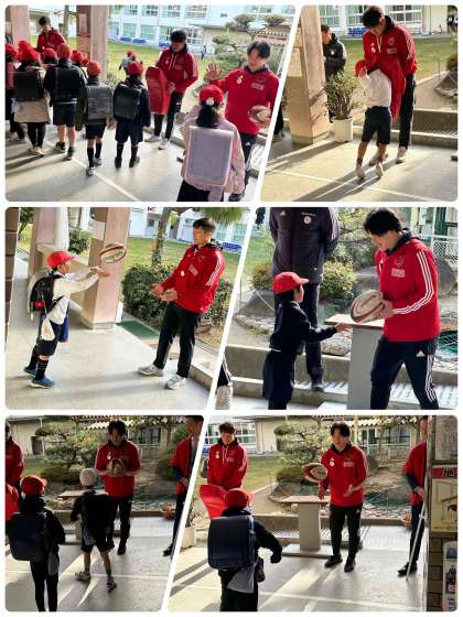 NTTドコモ レッドハリケーンズ の選手の方々が地域貢献の一つとして、あいさつ運動に来られていました。