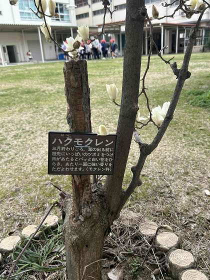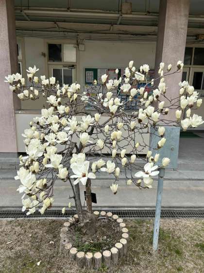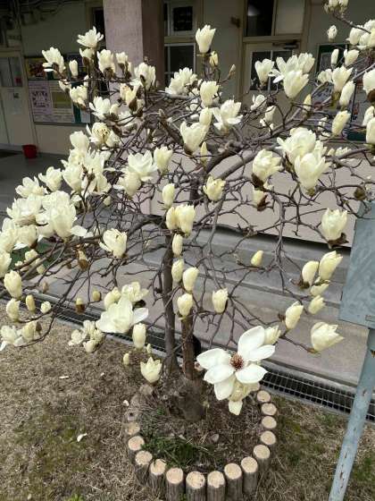 中庭の芝生の横にあるハクモクレンが、見頃です。