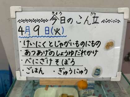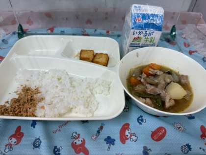 今日の献立は「鶏肉とじゃがいもの煮物、厚揚げの醤油だれかけ、紅鮭そぼろ、ご飯、牛乳」です。