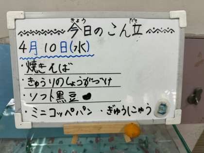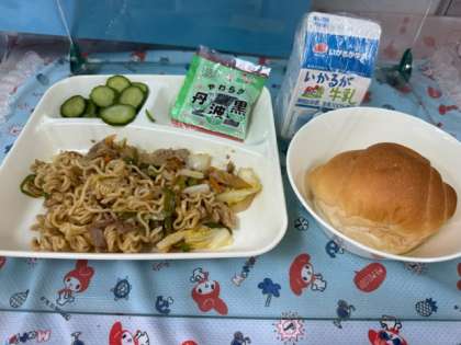 今日の給食は「焼きそば・きゅうりのしょうがづけ・ソフト黒豆・黒糖ロールパン・牛乳」です。