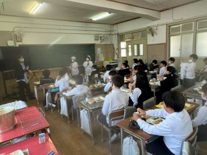 給食の焼きそばの麺は、乾麺を使っています。かためにゆでてから炒めています。ちぢれた麺にソースがよくからみます。焼きそばは、好きな子が多いです。