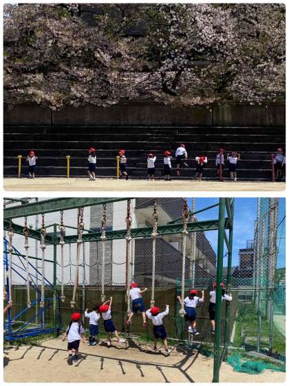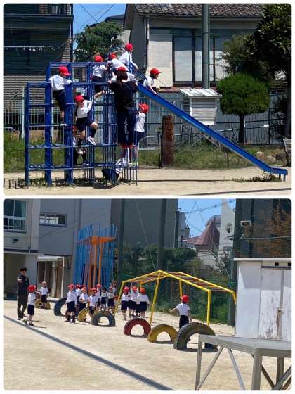 初めての体育の学習をしました。2列や4列に並んだり、遊具で遊んだりしました。たくさん遊んで、体を動かしました。