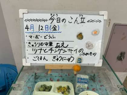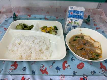 今日の給食は「マーボーどうふ・きゅうりの中華あえ・ツナとチンゲンサイのいためもの・ごはん・牛乳」です。