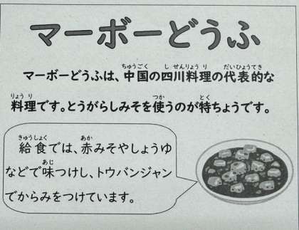 マーボーどうふは、子どもたちにも食べやすいように、辛みをおさえています。味付けに赤みそを使っているので、ごはんにとてもよく合う献立です。