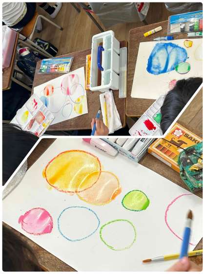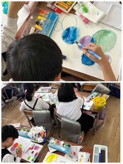 絵の具でにじみを使ってシャボン玉を描いています。素敵なシャボン玉がたくさんできていきました。