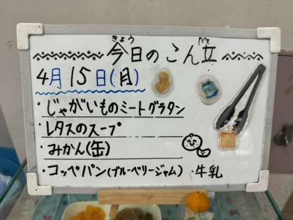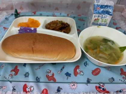 今日の給食は「じゃがいものミートグラタン・レタスのスープ・みかん(缶)・コッペパン・ブルーベリージャム・牛乳」です。
