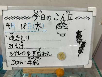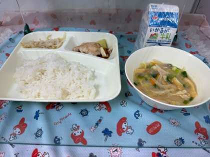 今日の給食は、「焼きとり・みそ汁・もやしのゆずの香あえ・ごはん・牛乳」です。