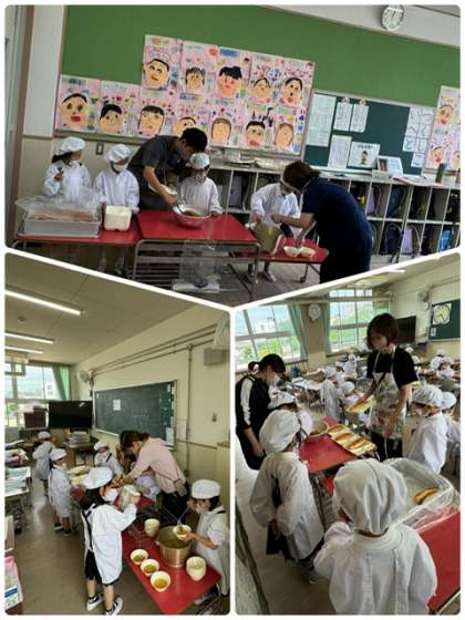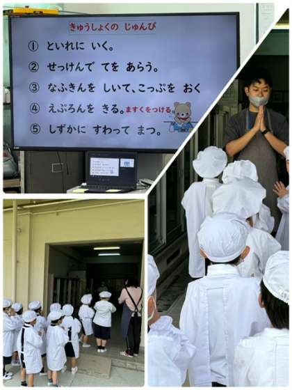 今まで6年生のおにいさん、おねえさんが応援していましたが今日から1年生だけで給食当番をがんばっています。落とさないように気をつけながら運ぶことができました。