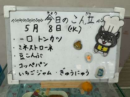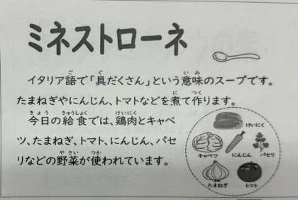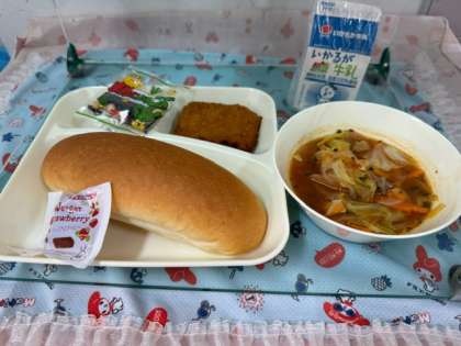 今日の給食は、「一口トンカツ・ミネストローネ・豆こんぶ・コッペパン・いちごジャム・牛乳」です。