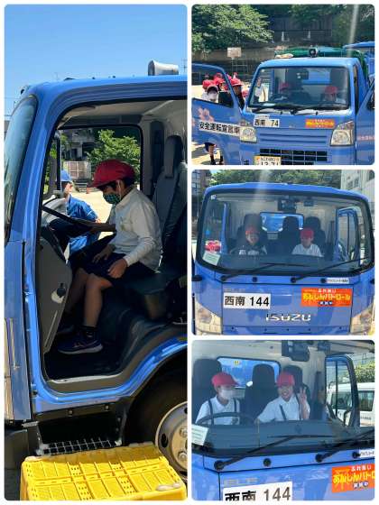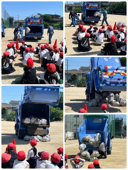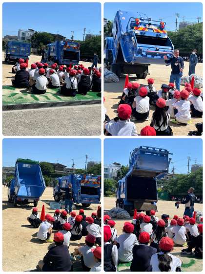 まずは、実際に運動場でゴミを集めるパッカー車について教えていただきました。ゴミを処理するところを見せていただいたり、運転席に乗せていただいたりしました。