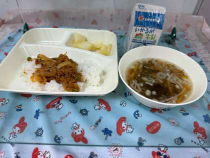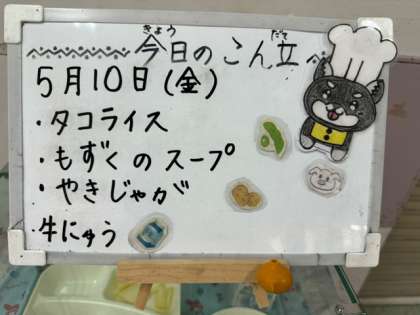 今日の給食は「タコライス・もずくのスープ・焼きじゃが・牛乳」です。