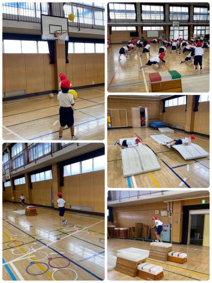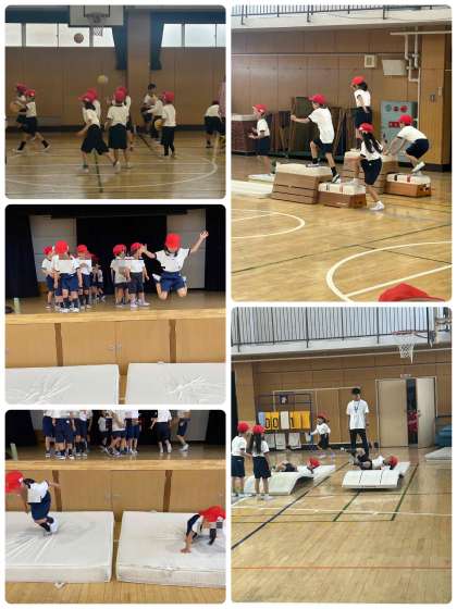 雨で運動場が使えないので、講堂でサーキットをしました。フラフープや跳び箱のお山、ボールをかごに入れ、舞台からふかふかマットにジャンプなどたくさん体を動かしました。初めての講堂体育に1年生はソワソワドキドキでした。