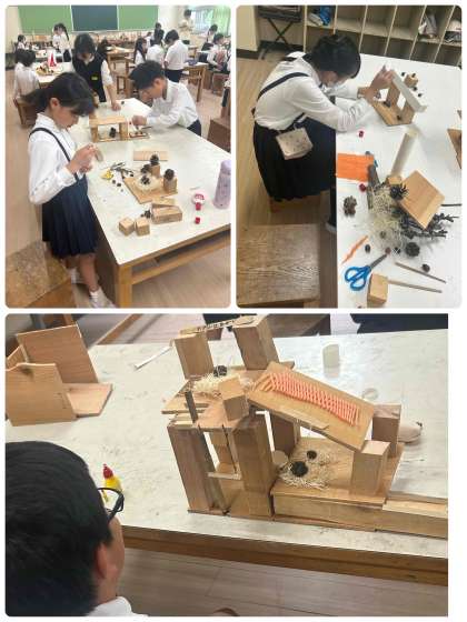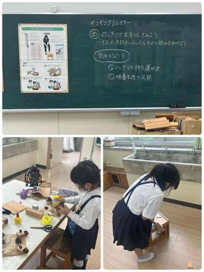 ノコギリを使って木材を切ったり、様々なものを組み合わせたりして、制作しています。どんなものに仕上がるのか、作品の仕上がりを楽しみにしていてください。