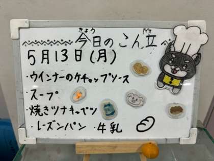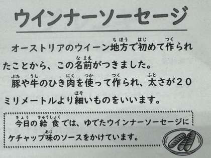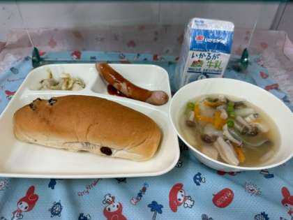 今日の給食は、「ウインナーのケチャップソース・スープ・焼きツナキャベツ・レーズンパン・牛乳」です。