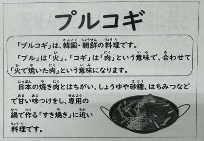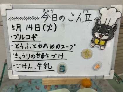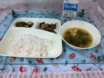 ?今日の給食は、「プルコギ・とうふのスープ・きゅうりの甘酢づけ・ごはん・牛乳」です。