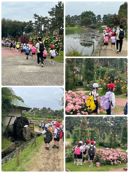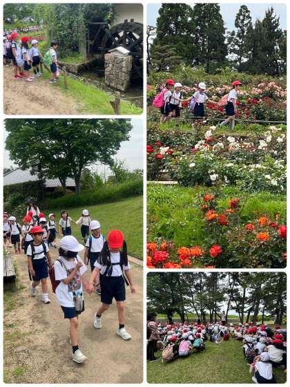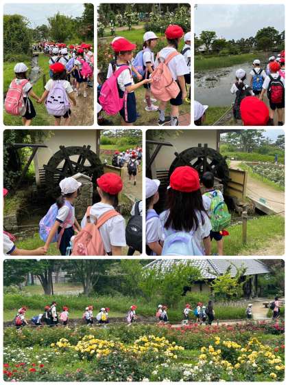 クラスごとに記念写真を撮影してから、1年生と2年生でこの前の学校探検をした時のグループとなり、見学を始めました。