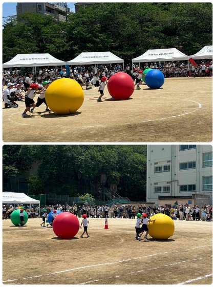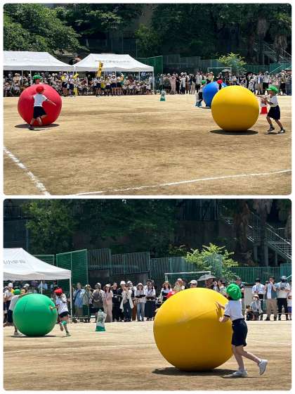2年生の団体競技です。マリオとルイージの帽子をバトン代わりに、大玉を転がして運んでいきます。