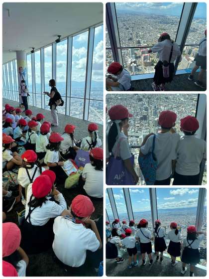 ハルカスの展望台から、大阪市の東西南北それぞれの景色を観察しています。