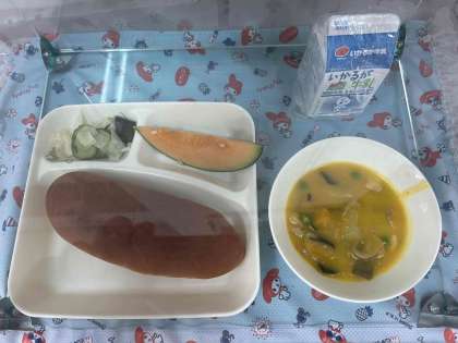 鶏肉とかぼちゃのシチュー、ミックス海藻のサラダ、クインシーメロン、黒糖パン、牛乳