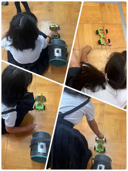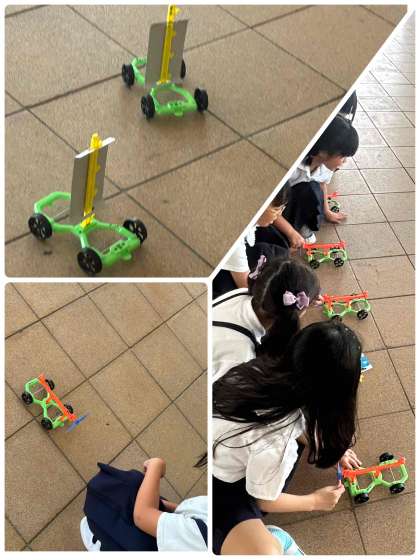 ものの動く力について実験を通して学んでいます。風やゴムの力で動く車の模型を使って、その仕組みについて学んでいます。