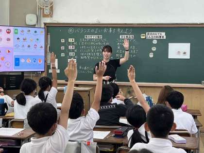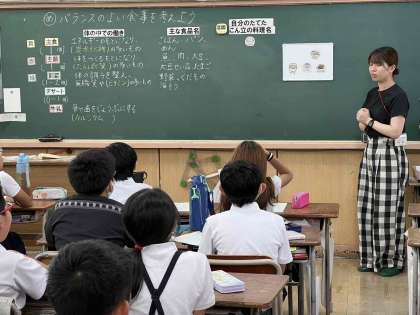 5年生の栄養学習では、バランスの良い食事について考えました。オリジナルの給食の献立を考えて、主食・主菜・副菜・デザートに分類し、バランスが良いかどうかを確かめました。好きなものばかりではバランスの良い食事にはならないことを知り、自分たちにできることを考えました。