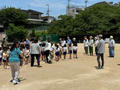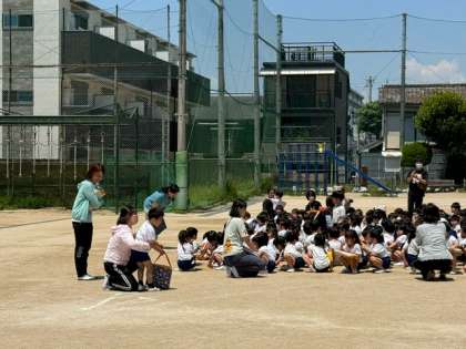 お昼の時間に、東粉浜幼稚園の園児のみなさんが教職員の方や地域の方と一緒に本校に避難をする訓練をしていました。