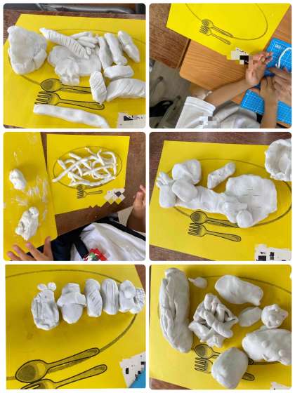 「ねんどでごちそうなにつくろう」ということで、粘土でごちそうパーティをしました。いろいろな食べ物を思い浮かべて、好きな食べ物を工夫して作りました。ラーメン、お寿司、パスタ、ジュース、ボットドック、お子様ランチ、想像がとまらず、おなかがすいた〜!給食まだかなあの声がたくさんでした。