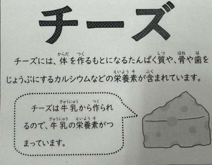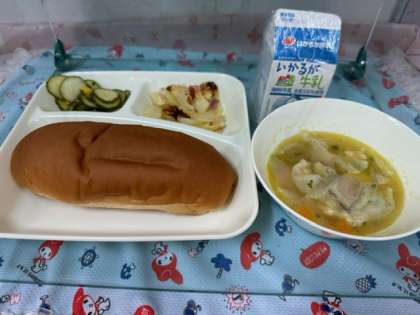 今日の給食は、「鶏肉とてぼ豆のスープ煮・ベーコンとじゃがいものチーズ焼き・きゅうりのサラダ・こくとうパン・牛乳」です。