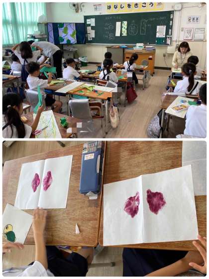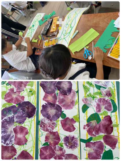 5月から育てているアサガオは毎日たくさんの花を咲かせています。きれいに咲いているアサガオの花をこすって半紙を染めて、切って画用紙に貼って、花を咲かせました。花の色がとてもきれい、同じ赤色でもちょっと違うねと、楽しく活動に取り組みました。