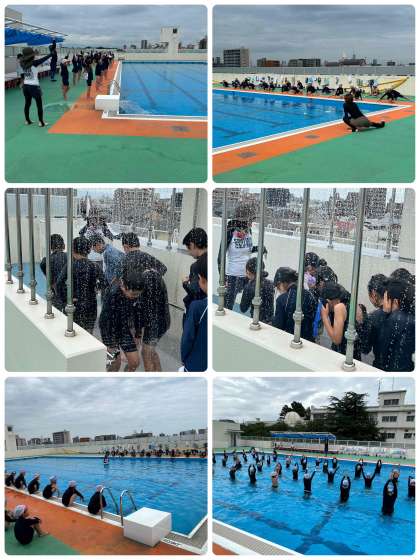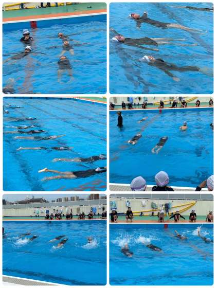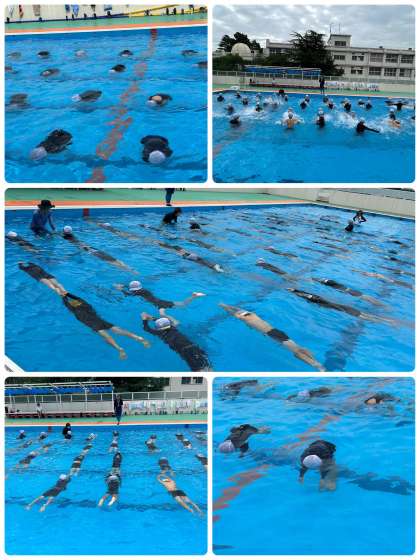 はじめに命を守る水泳学習であることを校長先生から聞いた後、真剣な顔で体操,シャワーと続き、入水。