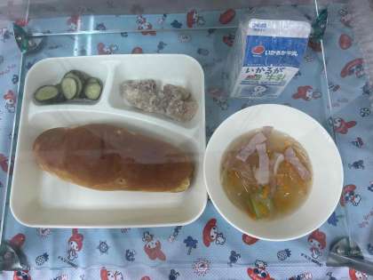 鶏肉の唐揚げ、ハムと春雨のスープ、きゅうりの中華和え、おさつパン、牛乳